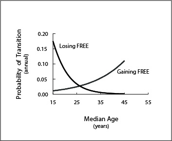 Figure 2. The age-structural probabilities of gaining FREE and losing FREE, once assessed with FREE status. [Trend 2]