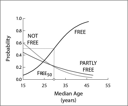 Figure 1. The functional form of the Age-structural Model of Liberal Democracy, showing Free50 positioned at the median age of 29 years.
