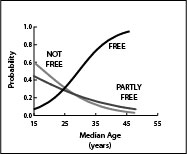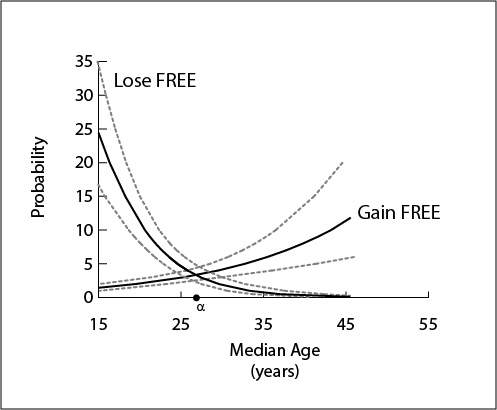 Fig. 2. The probabilities of gaining FREE and losing FREE at different points in the age-structural transition (measured by median age).