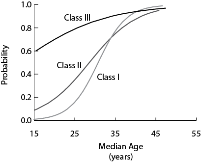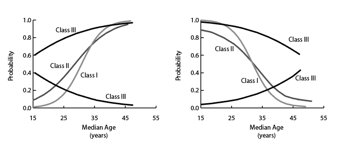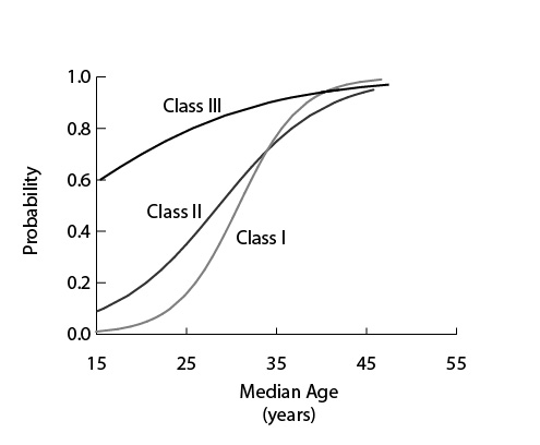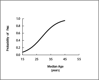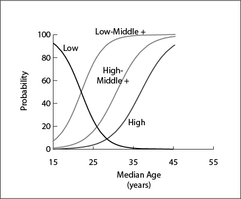 These three classes suggest differences in the strength of the relationship’s directionality and punctuality. Functional directionality can also be expressed as the ratio between the frequency at which it advances into a category, relative to the frequency at which it retreats back into this category. Class I age-structural functions (such as income and education functions) express high ratios of directionality and feedback between the indicator and movement along the age structural transition (or fertility decline). Class III functions (such as the frequency of intra-state conflict or the initiation of intra-state conflict) typically express low ratios. Class II functions (such as being assessed as Free in Freedom House’s annual survey) are like class I functions, but not as directional. States backslide more often, and there may be very little feedback, if any, associated with the relationship. Functional punctuality measures the tendency for advancement to be associated with a particular median age. This quality can be measured by the steepness of the curve (i.e., value of first derivative) at its inflection point (where p=0.50). Class I age-structural functions are most punctual; class III, the least.