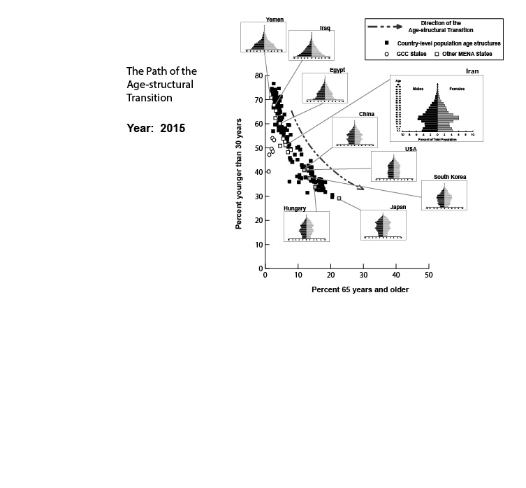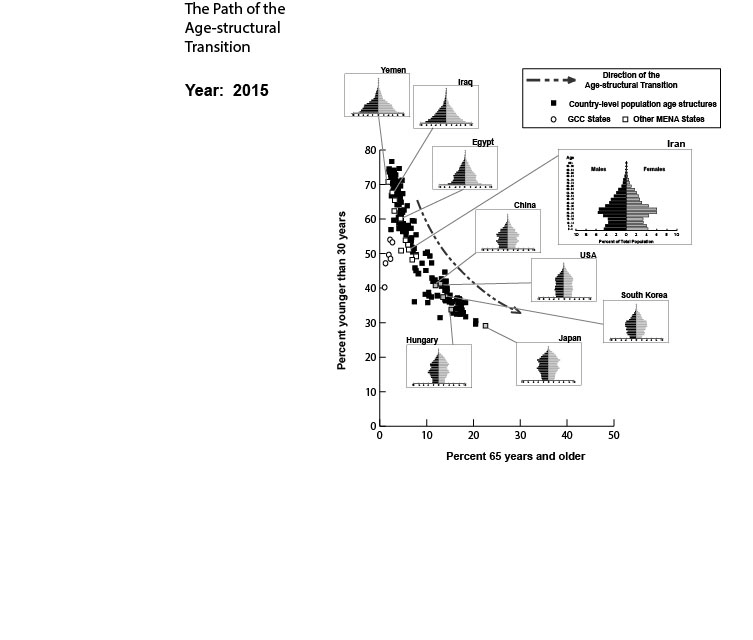 The course of the age-structural transition is pictured by positioning the world’s states (in 2015) in terms of their proportion of young people (less than 30 years of age) and seniors (65 and older).