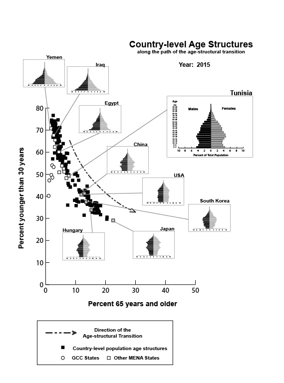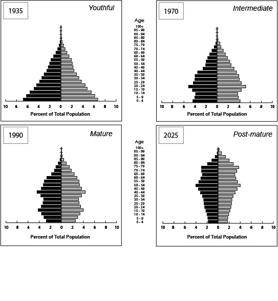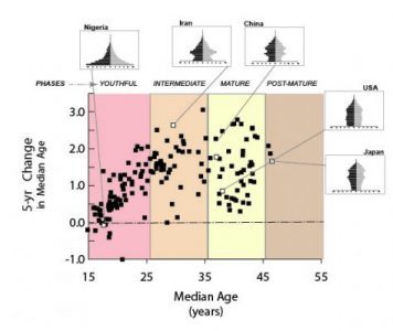 Maps. The age-structural phases of countries in Europe and in parts of Africa and Asia, 2015 & 2035 (projected). Maps represent the UN Population Division’s current estimates of median ages for 2015 and projections for 2035 (UN medium fertility variant). By 2035, most of Europe’s states will likely have advanced into post-maturity, whereas in the Sahel and tropics of Africa, countries will probably still be in the youthful phase of the age-structural transition.
