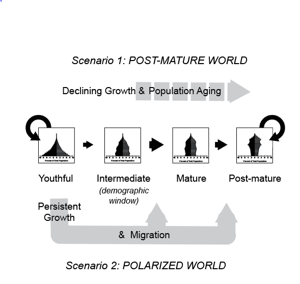 Figure 1. Post-mature World and its alternative Polarized World, showing the Global Trends four-phase schema representing the path of the age-structural transition. Black arrows indicate the transition’s path and identify the two hard-to-escape demographic conditions, the youthful and post-mature phases. In a Post-mature World, countries age and their populations eventually decline. In a Polarized World, human population continues to grow in the youthful regions, stimulating increased migration to nearby states and to more mature regions.