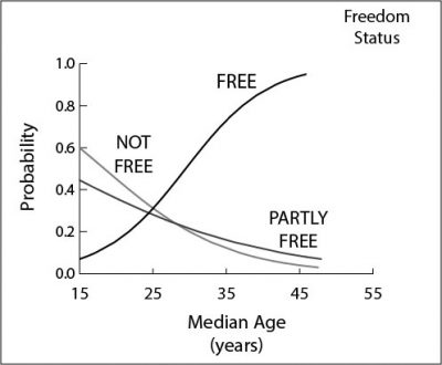 Fig. 1. The relationship between median age (i.e., age-structural maturity) and the probability of being assessed as FREE by Freedom House. Estimates for PARTLY FREE and NOT FREE are shown as well.