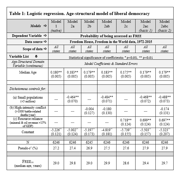 Table 1.  Logistic regression statistical table for the age-structural model of liberal democracy. Dichotomous controls are small populations, the presence of high-intensity conflict, and reliance on oil or mineral resources (each defined in the table).