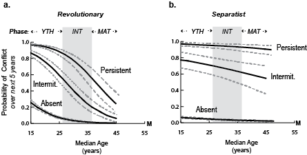 Unlike other foreign-policy perspectives, political demography’s recommendations are rooted in published research that uses models, based on 50 years of age-structural data (estimates of the numerical distribution of residents, by age), to predict various forms of political behavior and socioeconomic performance. A growing body of research demonstrates that countries in the youthful phase of the age-structural transition (Fig. 1), as a group, have been the most likely to be engaged in armed civil conflict, to occupy the lowest levels of social and economic development, and to lose liberal democracy. Recent research on successful coups d’état also shows a similar demographic pattern of risk. In each case, the shift from a youthful to an intermediate age-structure—the result of a decline in fertility to below 3 children per woman—is associated with lower probabilities of political instability and higher probabilities of development.