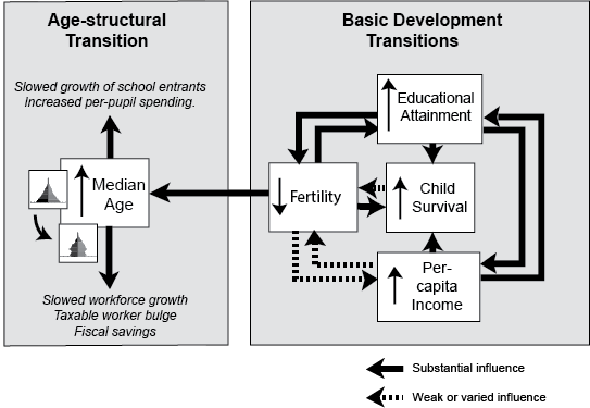 - And lastly, progress along the age-structural transition simply discloses poorly visible set of social and institutional transformations that precede more extensive, more observable socioeconomic and political changes.
